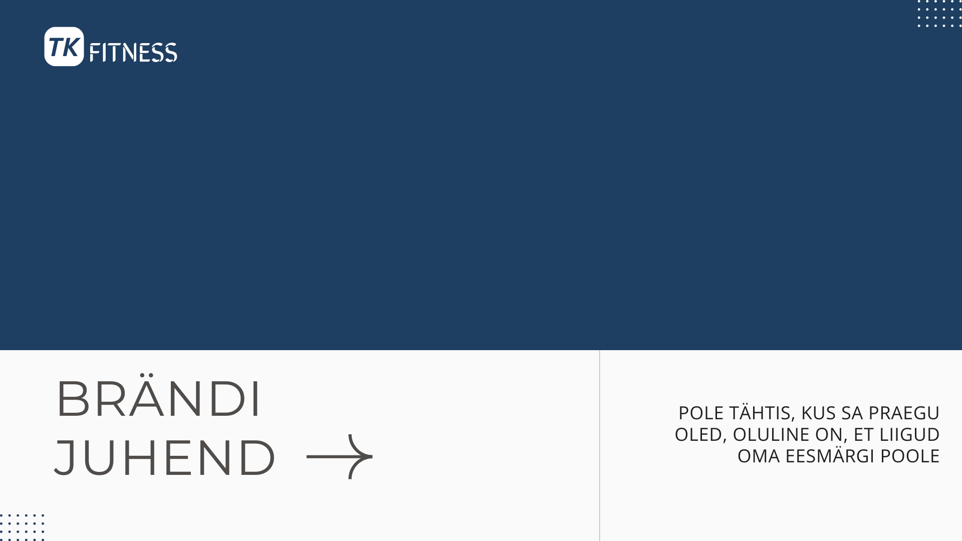 TKFitnessi projektis alustasime brändingu loomisest, mille käigus kujundasime tervikliku visuaalse identiteedi – logo, värvipaleti ja tüpograafia, mis väljendavad brändi energiat ja professionaalsust. Sellele tuginedes kujundasime ja arendasime one pager tüüpi kodulehe, mis kannab uut identiteeti edasi digitaalses keskkonnas.